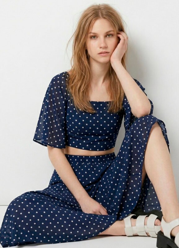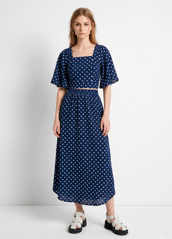 Conjunto Saia Longa e Blusa Azul de Bolinhas Brancas Póa Sob