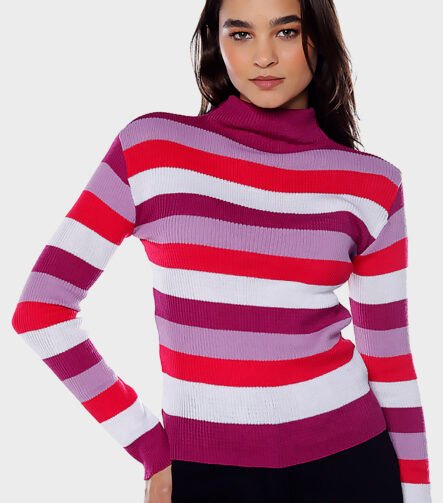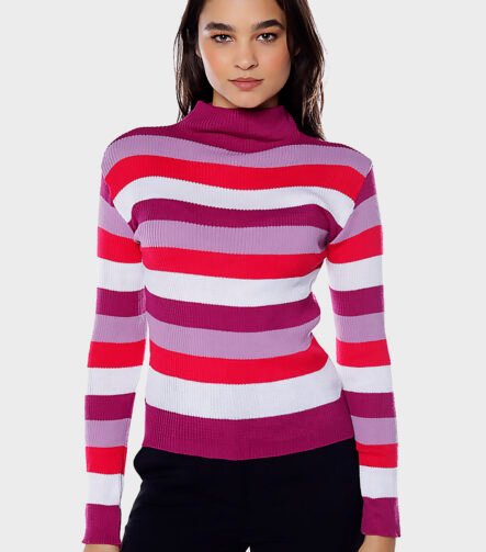 Blusa de Tricot Listrada Gola Alta Sob Rosa e Lilás