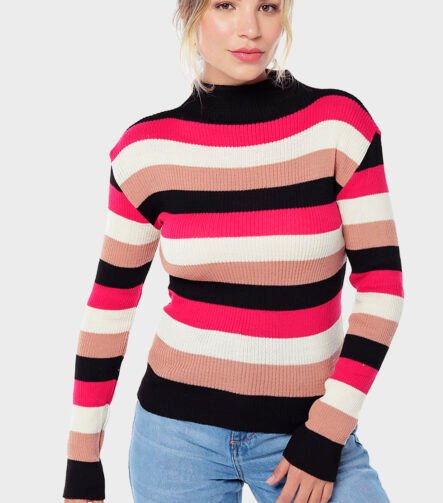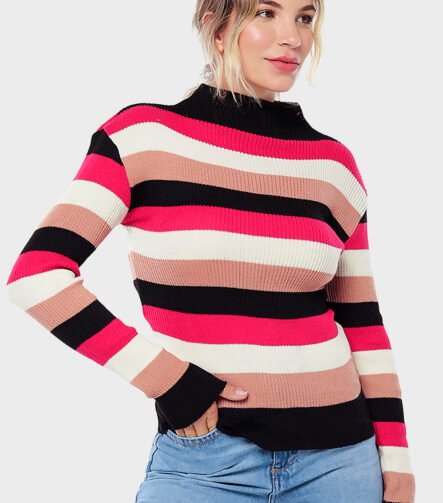 Blusa de Tricot Listrada Gola Alta Sob Rosa e Preta