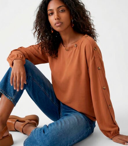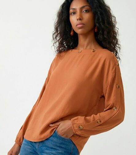 Blusa Caramelo Gola Canoa em Crepe Manga Longa Sob Botões
