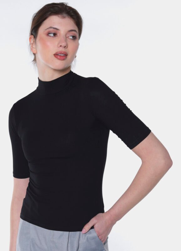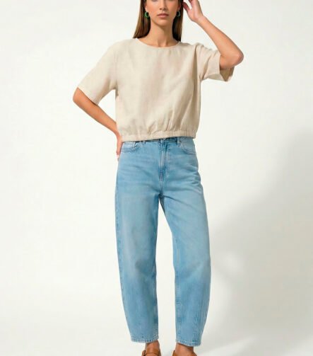 Blusa Bege Decote Canoa Manga Curta Viscose com Linho Sob