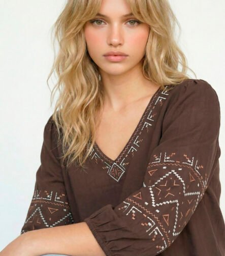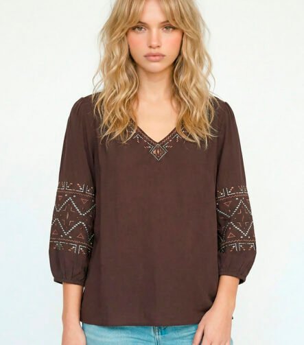 Blusa Marrom Café Bordada Gola V em Viscose Manga 3/4 Sob