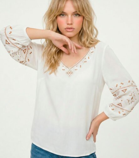 Blusa Branca Bordada Gola V em Viscose Manga 3/4 Sob