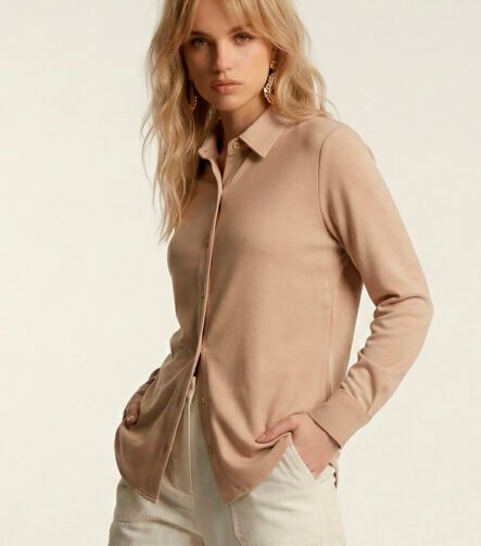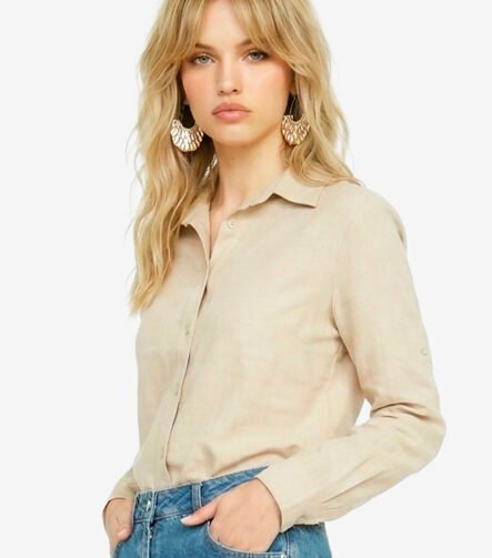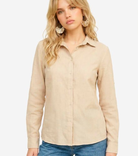Camisa Bege Mocca Feminina em Viscose com Linho Manga Longa Sob