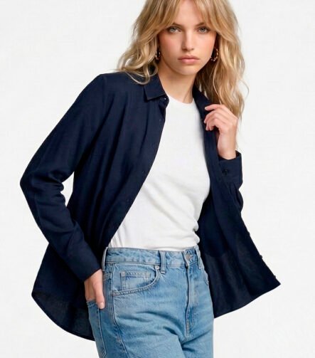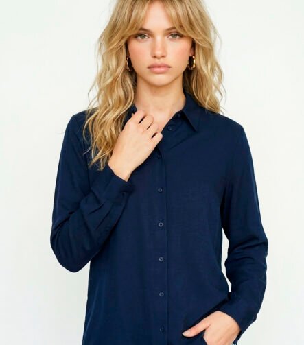 Camisa Marinho Feminina em Viscose com Linho Manga Longa Sob
