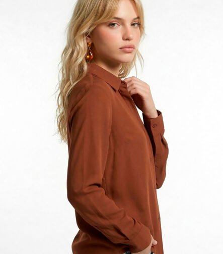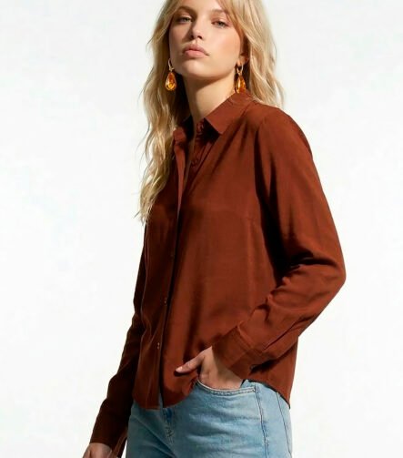 Camisa Marrom Café Feminina em Viscose com Linho Manga Longa Sob