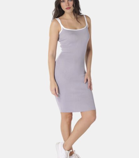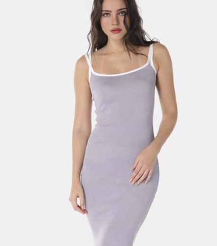 Vestido Midi Canelado em Viscose Cinza com Alças Brancas