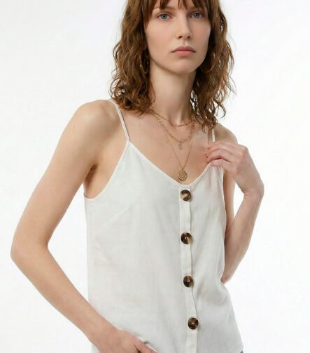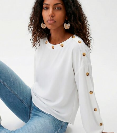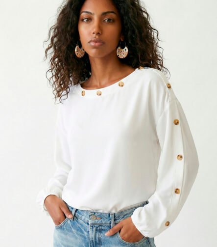 Blusa Branca Gola Canoa em Crepe Manga Longa Sob Botões