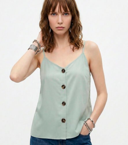 Blusa Caramelo Gola Canoa em Crepe Manga Longa Sob Botões