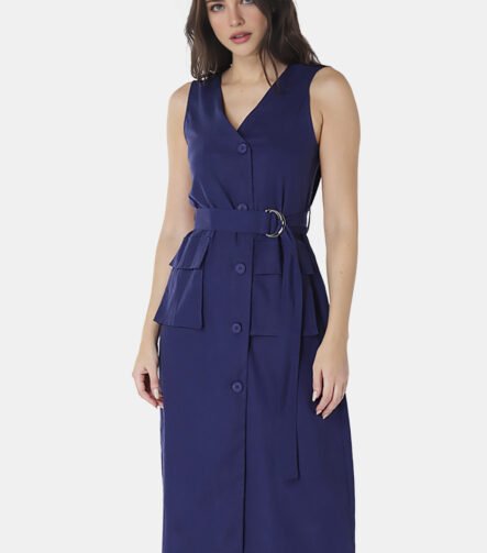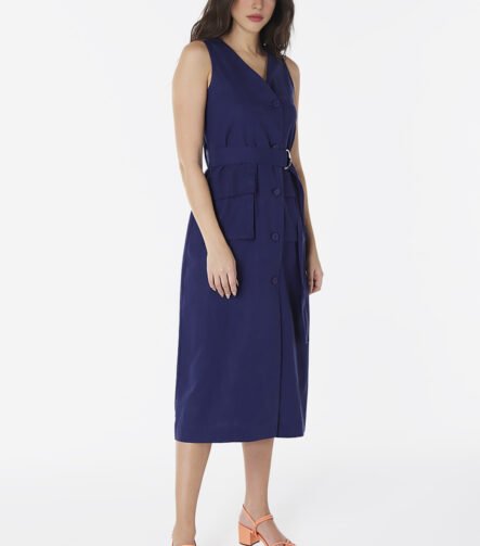Vestido de Linho Midi Azul Marinho Decote V Transpassado