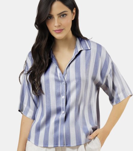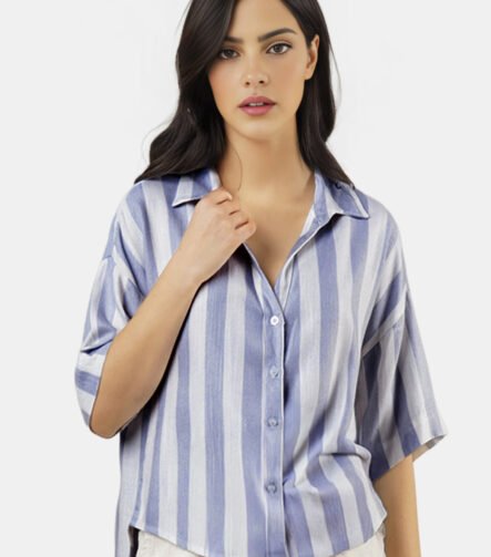 Camisa Feminina Listrada Branca e Azul Viscose Manga Curta