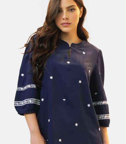 Blusa Marinho em Viscose Manga Curta Sob Bordada Colorida