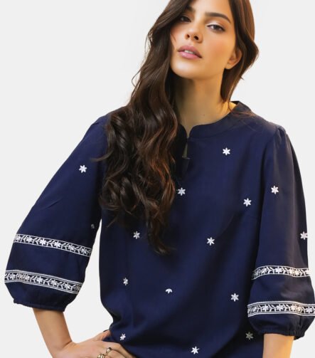 Blusa Feminina Marinho em Viscose Manga 3/4 Bordada Branco