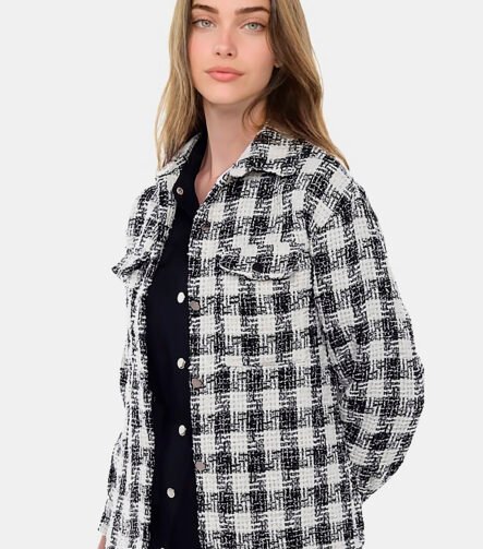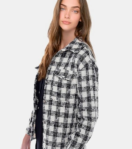 Jaqueta Xadrez Preta Feminina de Lã Tweed com Bolsos