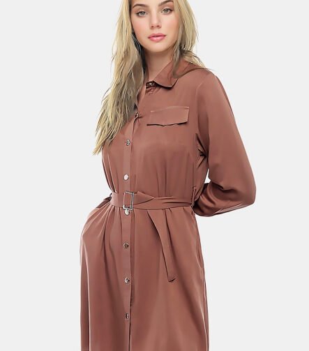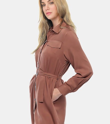 Vestido Chemise Marrom Manga Longa com Bolsos e Cinto Sob