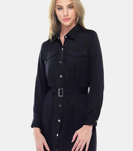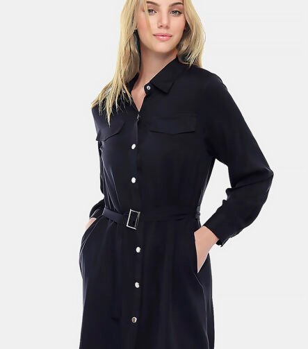 Vestido Chemise Preto Manga Longa com Bolsos e Cinto Sob