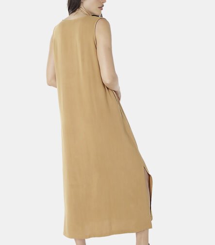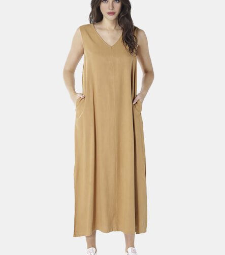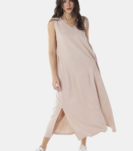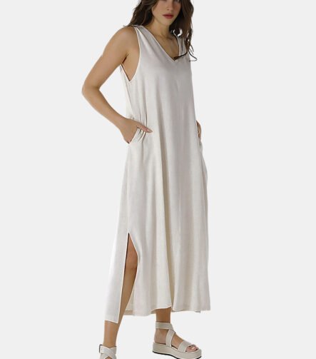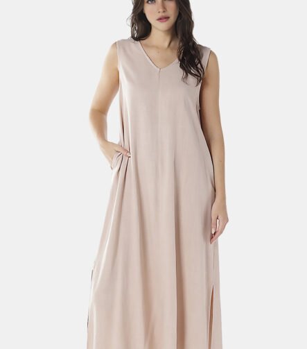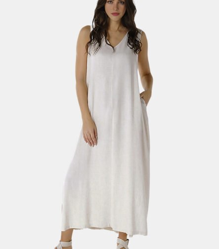 Vestido Longo de Linho Areia Gola V com Bolsos Sob