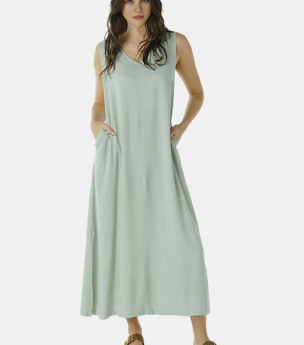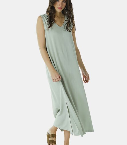 Vestido Longo de Linho Verde Gola V com Bolsos Sob