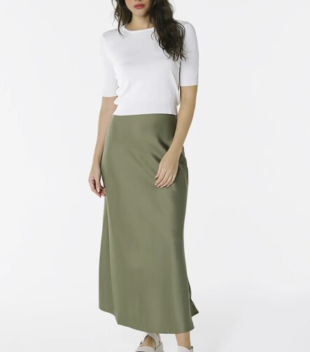 Saia Longa de Cetim Evasê com Elastano Verde Militar Sob