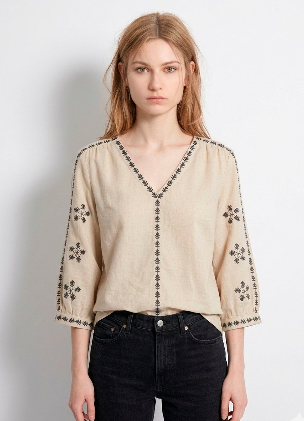 Detalhes: Blusa bordada em viscose manga 3/4. Decote V com contorno bordado em linha, acabamento em revel. Mangas 3/4 bordadas, com punho fino bordado. Ombros levemente franzidos.Pala nas costas para melhor caimento, com prega. Barra reta solta. Tecido em 100% algodão com textura de linho.
