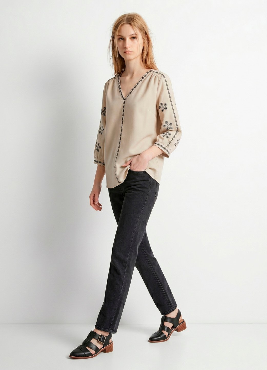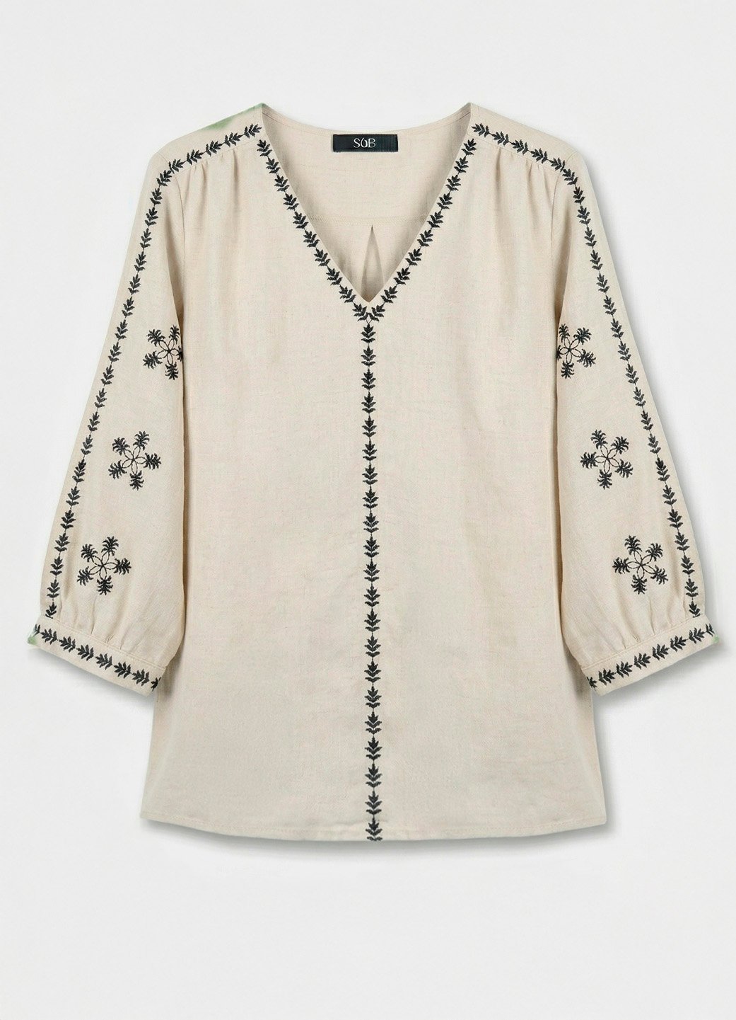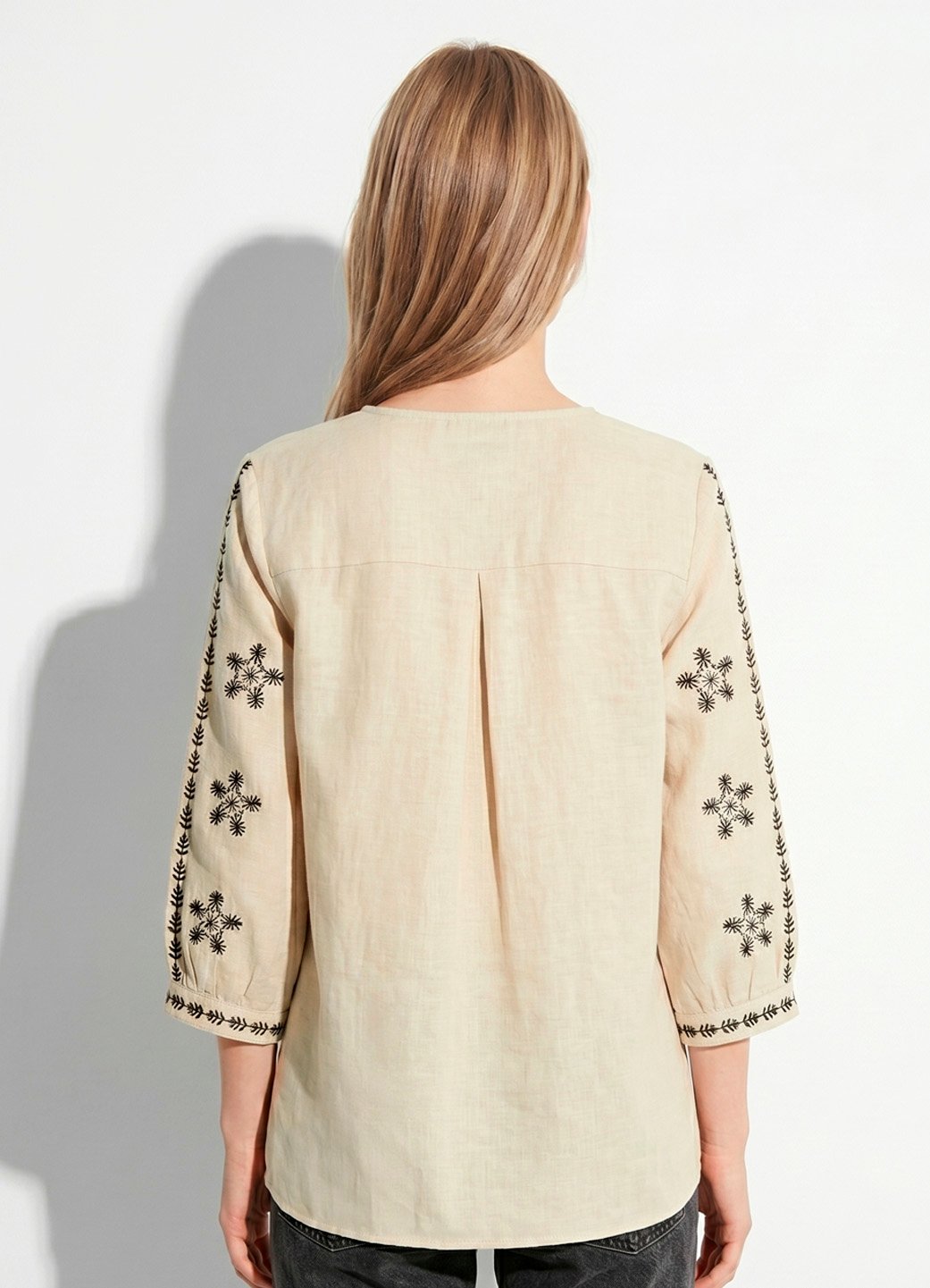 Blusa Bege Bordada Gola V em Algodão Manga 3/4 Sob