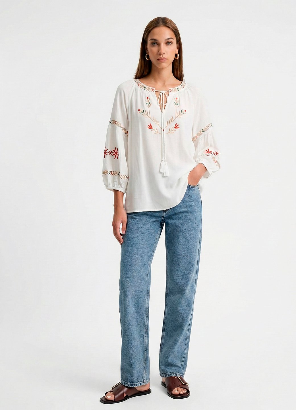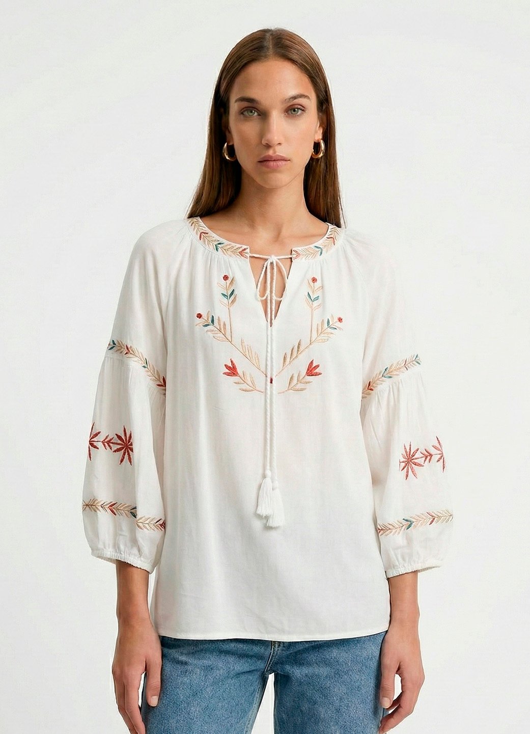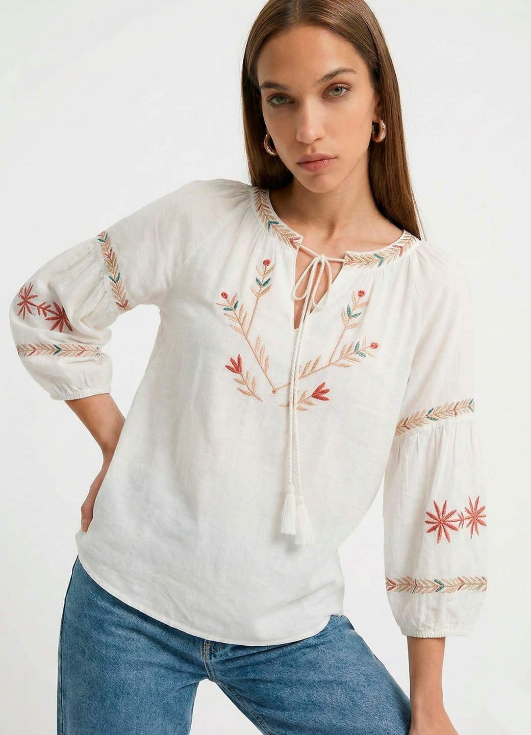 Detalhes: Blusa bordada em linha ponto cheio, com manga 3/4. Decote redondo com pequeno v na frente,bordado e acabamento em revel. Cordão com pendente de linha para fechamento do decote. Frente bordada em linha mas cores bege claro, laranja e toques de verde. Mangas 3/4 com detalhe bordado e recorte com franzido. Punho solto com elástico fino. Barra reta. Tecido em 100% viscose macio, plano, leve.