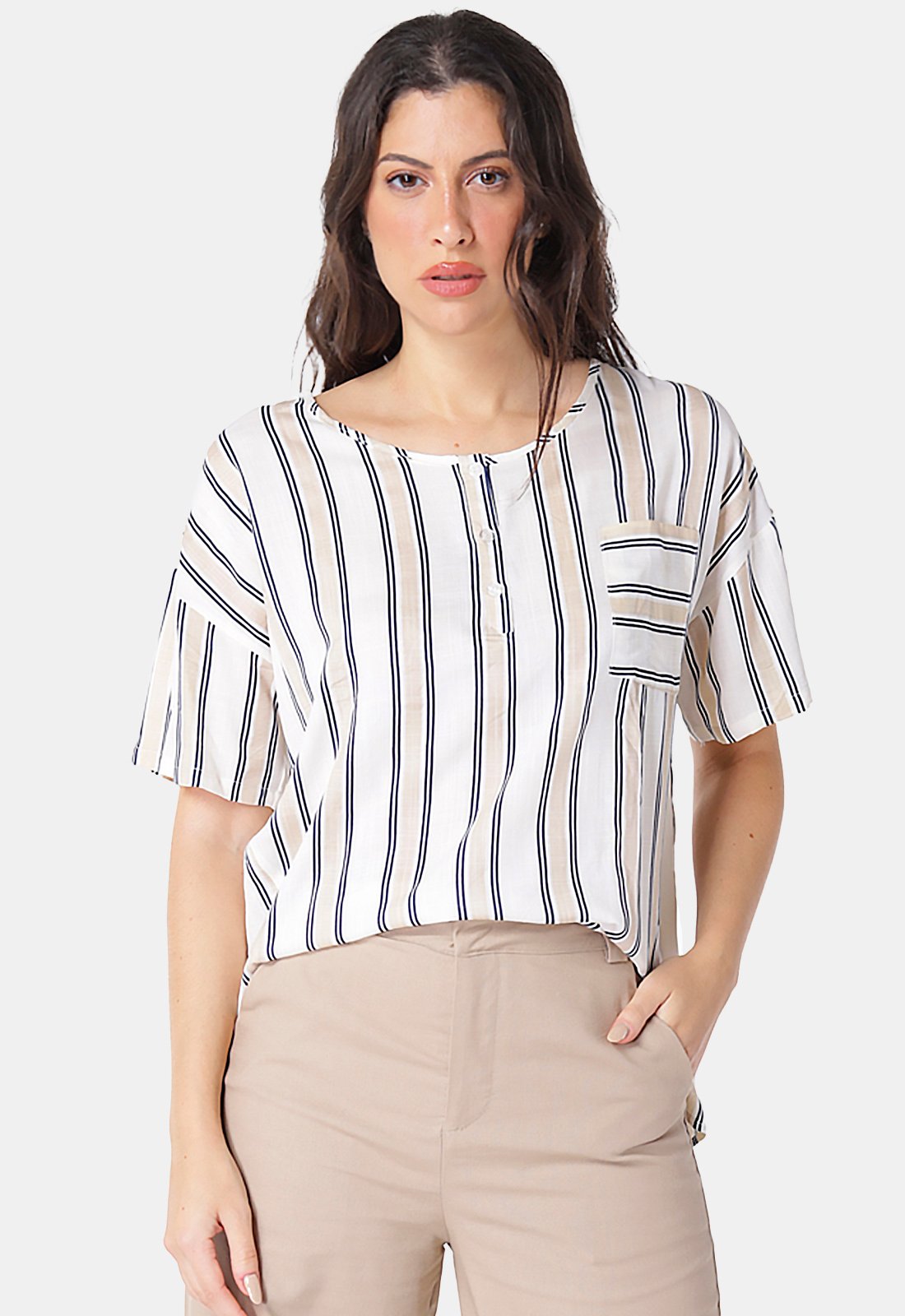 Detalhes: Blusa listrada com barra ajusta e recorte frontal. Mangas curtas com ombro deslocado. Decote canoa com acabamento com vista e botões verdadeiros. Bolso verdadeiro do lado esquerdo. Recorte diagonal com abertura no quadril. Pala nas costas com prega. Barra arredondada mais curta na frente, 6 cm mais longas na parte traseira.