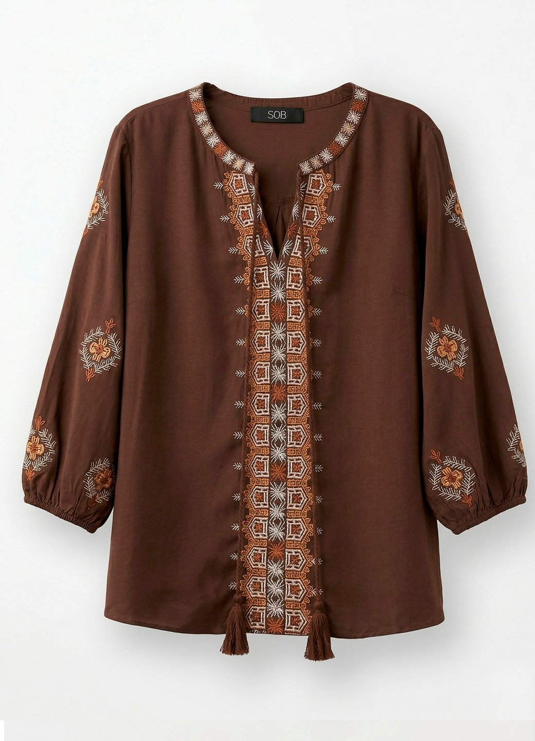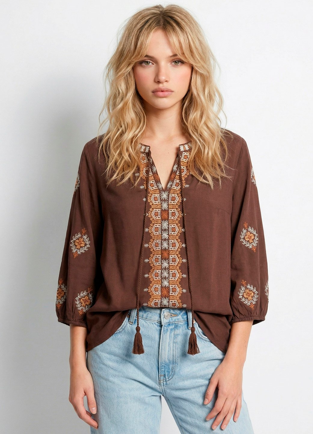 Blusa Marrom Bordada Manga 3/4 Gola Bordada Viscose Boho Sob