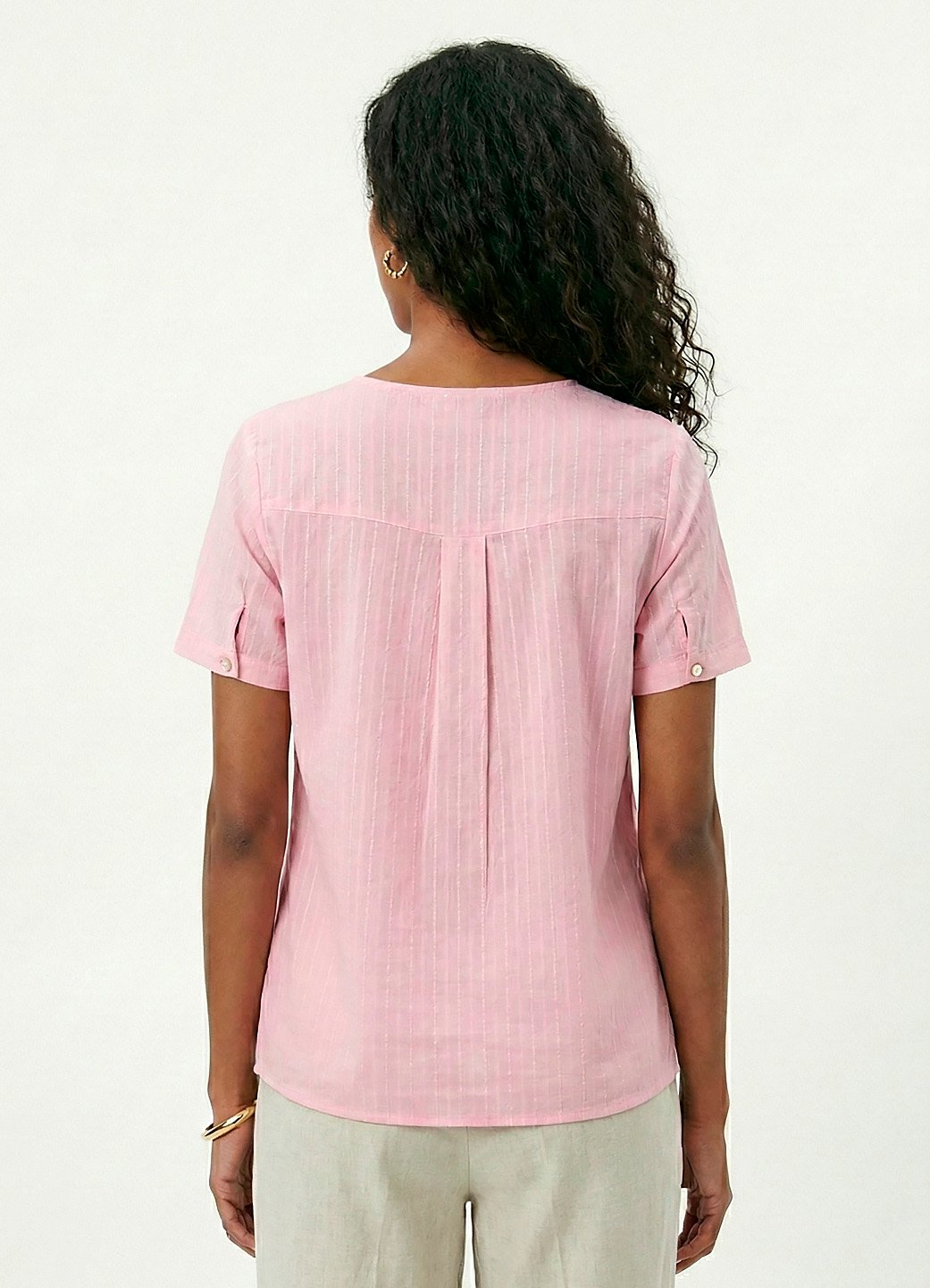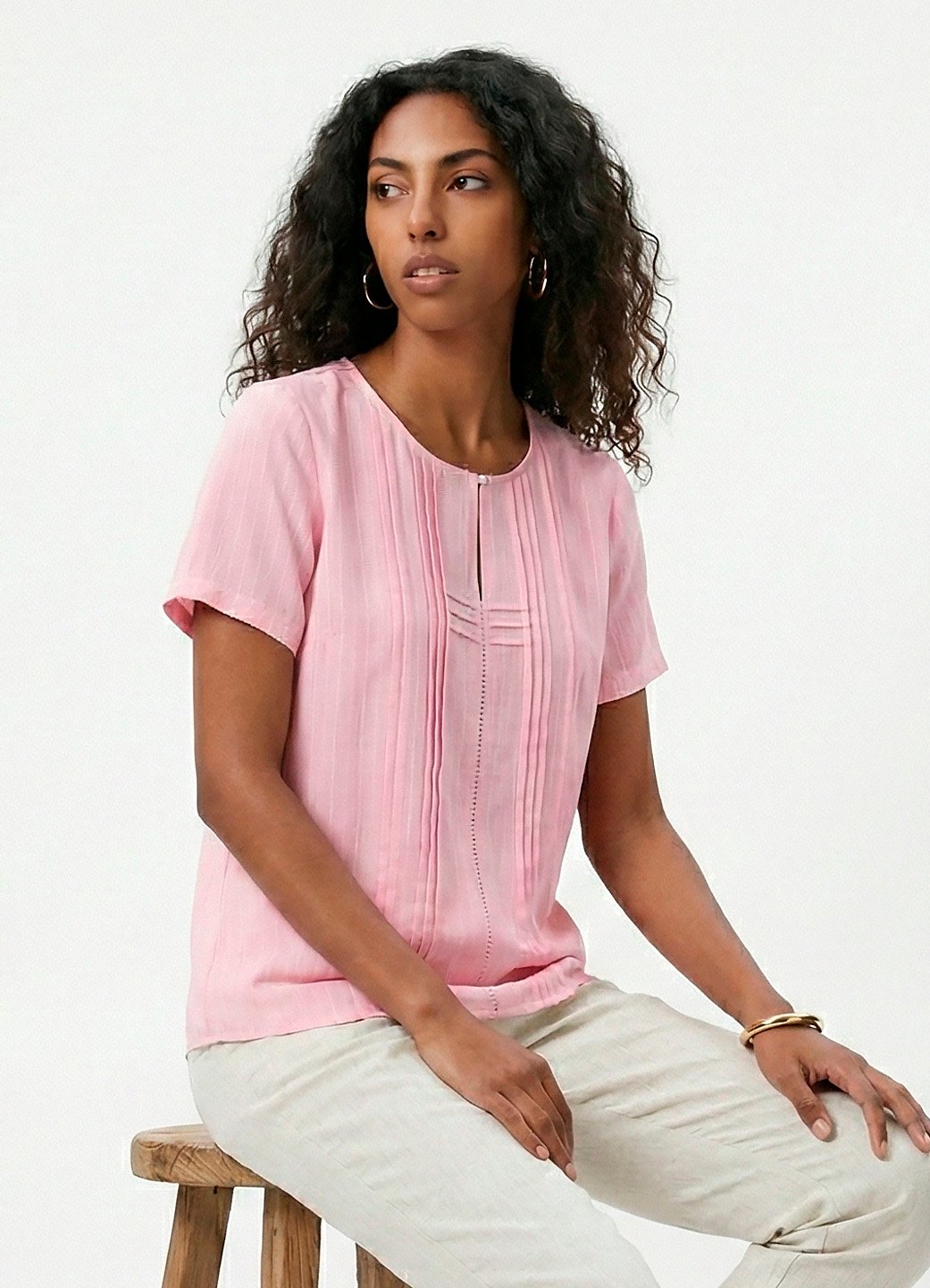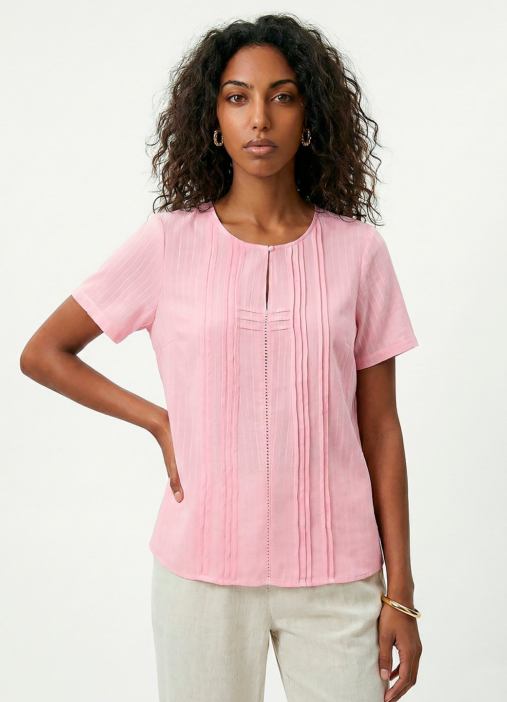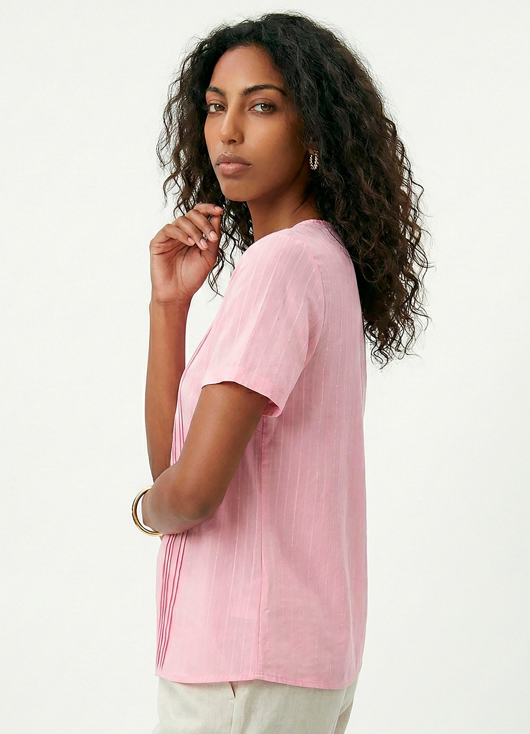 Blusa Rosa Claro Manga Curta em Viscose com Linho Sob Pregas