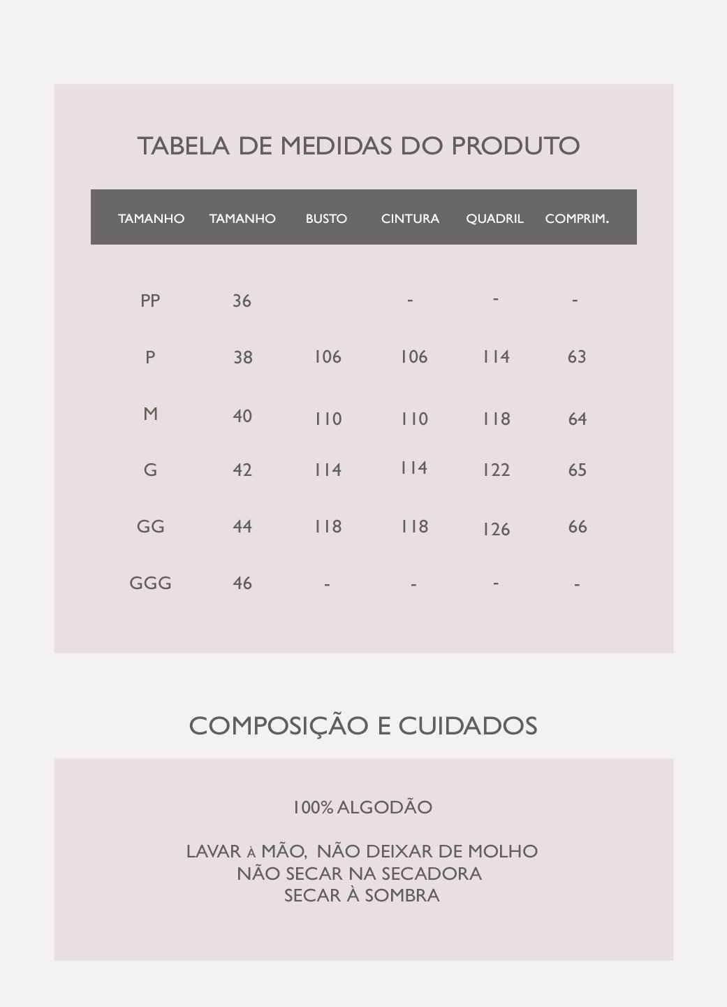 Modelo com 179 cm de altura, busto 82 cm, cintura 70 cm, quadril 96 cm.