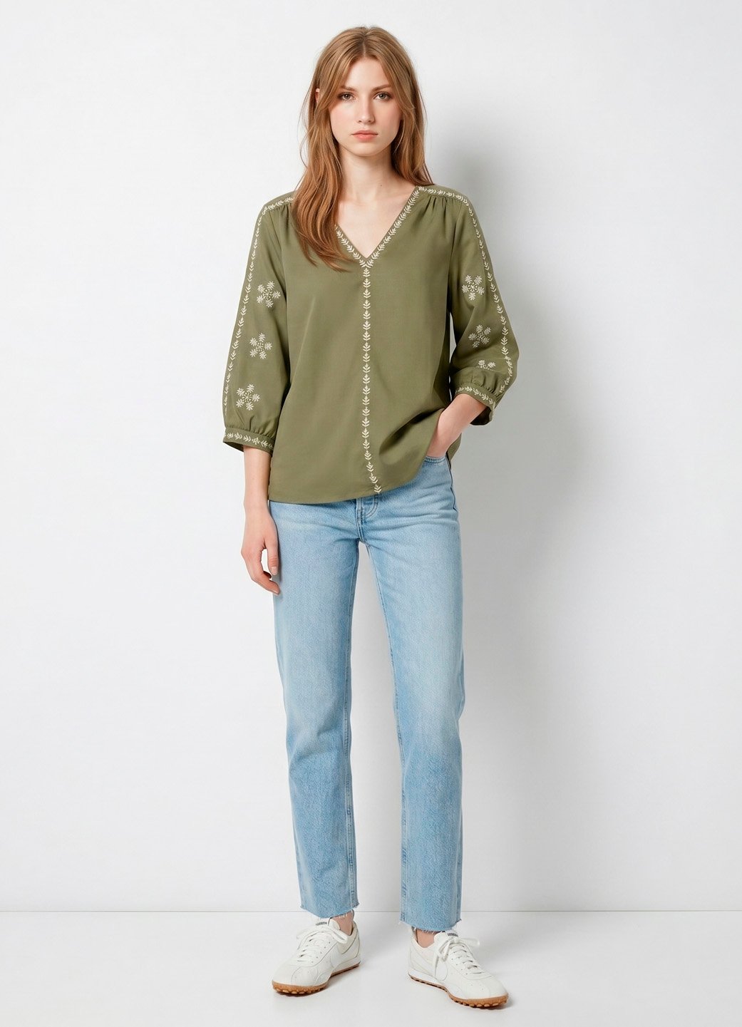 Detalhes: Blusa bordada em viscose manga 3/4. Decote V com contorno bordado em linha, acabamento em revel. Mangas 3/4 bordadas, com punho fino bordado. Ombros levemente franzidos.Pala nas costas para melhor caimento, com prega. Barra reta solta. Tecido em 100% algodão com textura de linho.