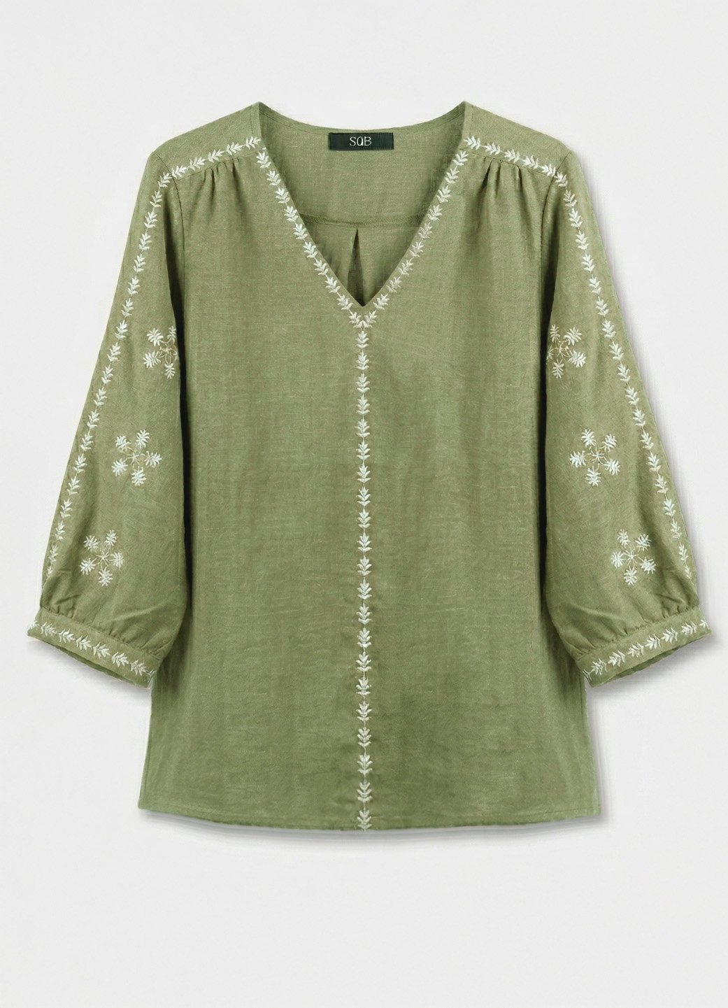Blusa Verde Bordada Gola V em Algodão Manga 3/4 Sob