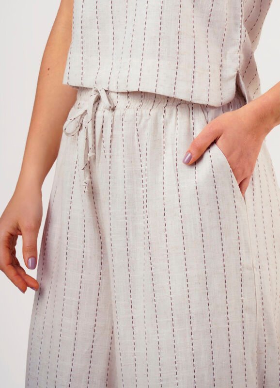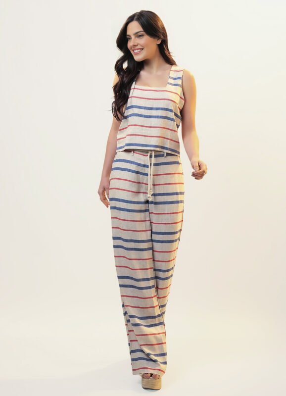 Detalhes: Calça pantalona de linho, alfaitaria feminina. Cós reto, com fechamento em gancho, e 5 passantes estreitos, acompanha cinto preto fino. Bolsos laterias verdadeiros. Pence nas costas. Pernas soltas (corte reto). Tecido encorpado, sem transparencia.