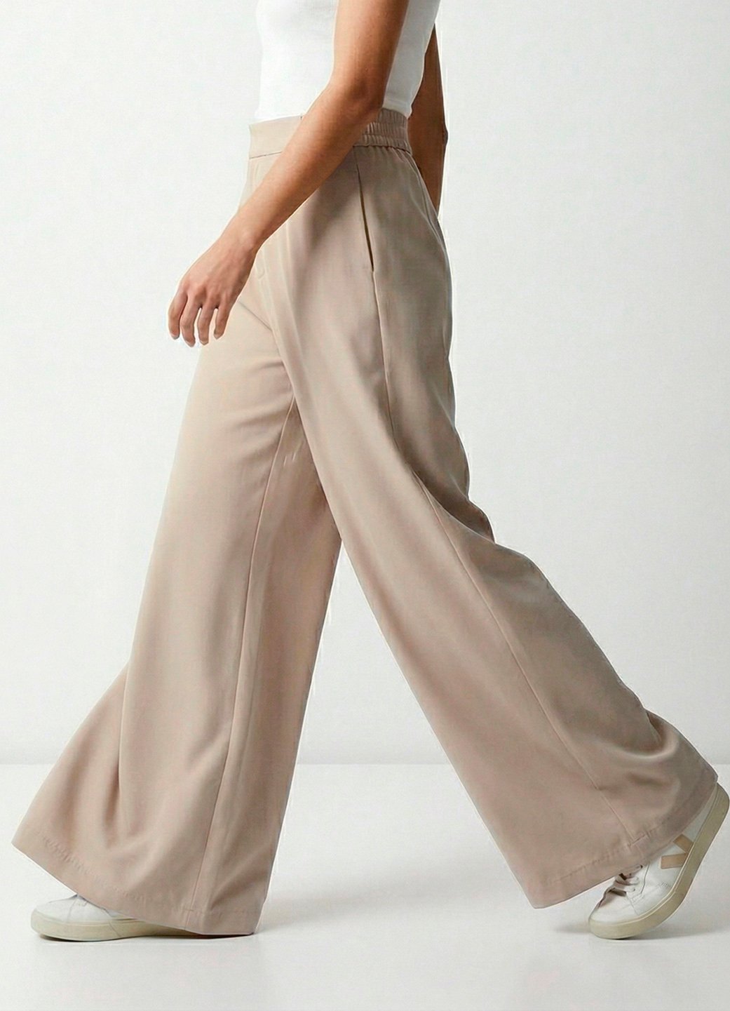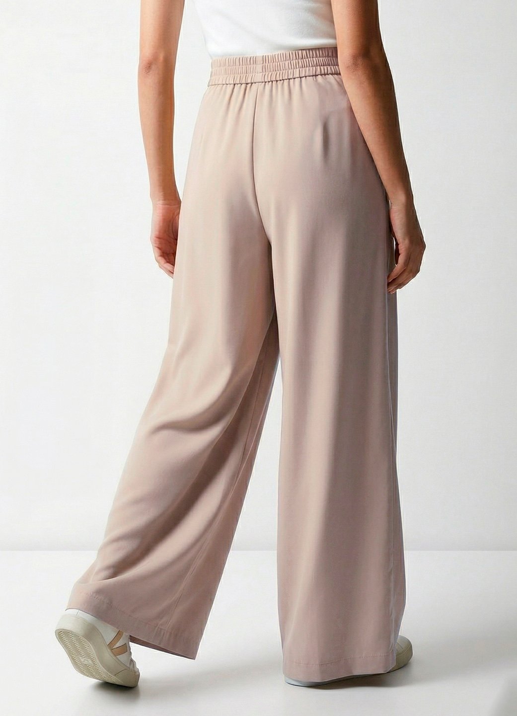 Detalhes: Calça de pregas pantalona wide leg em viscose. Cós liso na frente, e elástico nas costas. Fechamento em botão e zíper. Bolsos laterais embutidos na costura, verdadeiro. Duas pregas na frente de cada lado, rebatidas. Barra de 2cm. Pernas amplas e soltas. Tecido viscose twill, peso médio, fluido, com excelente caimento. Sem forro.