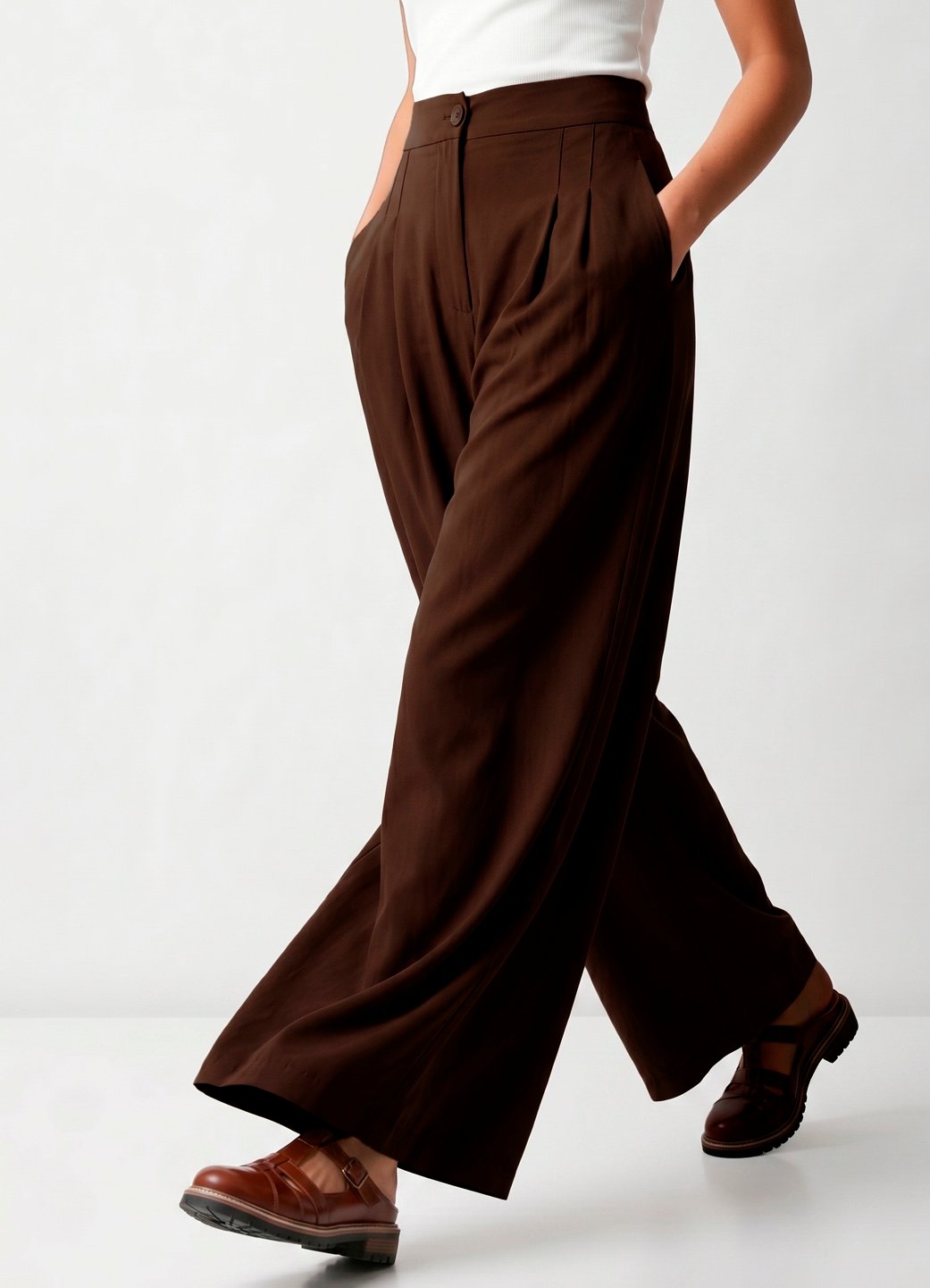 Calça Pantalona Marrom em Viscose com Pregas e Bolsos