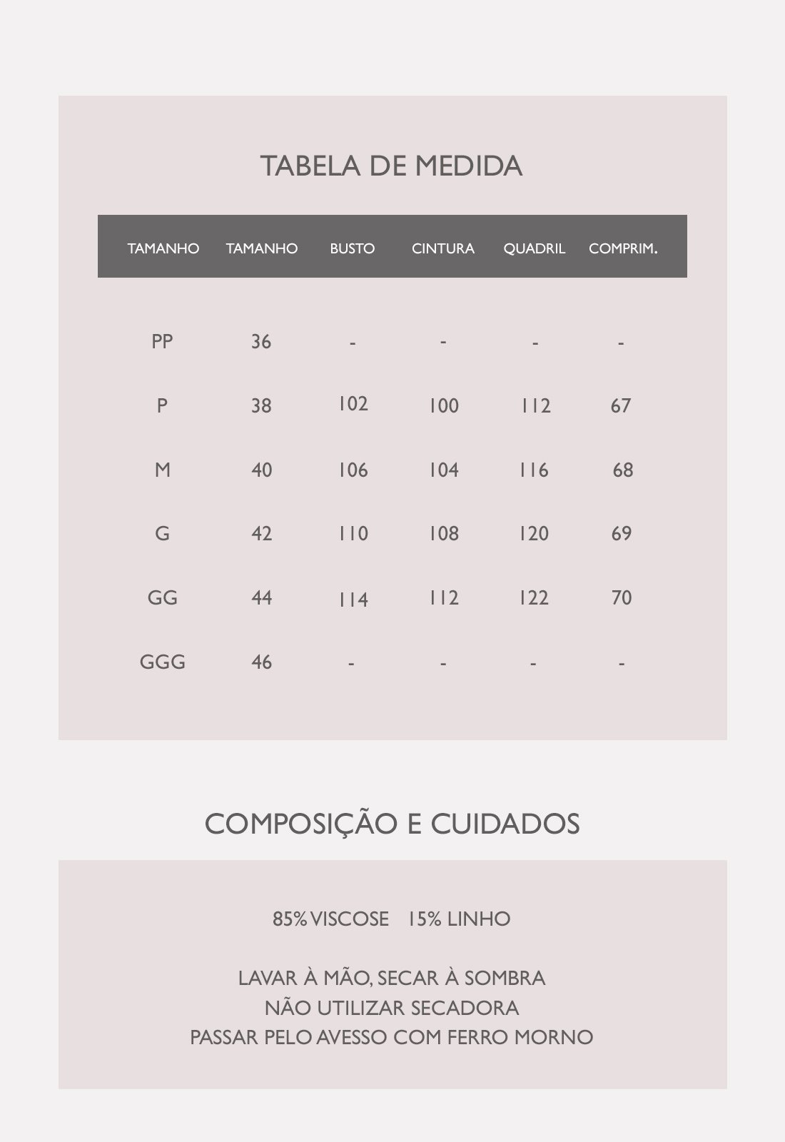 Modelo com 177 cm de altura, busto 86 cm, cintura 70 cm, quadril 96 cm.
