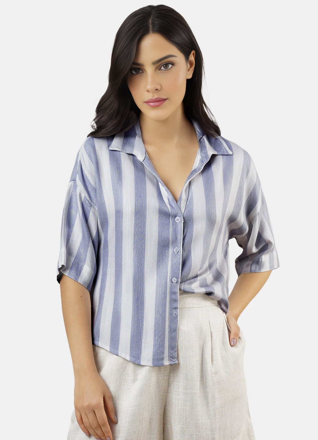 MODELAGEM GRANDE, P/38-40 Cor: Off white listrada de azul jeans Detalhes:Camisa feminina em viscose com mangas curtas. Frente com vista em V, fechamento em botões perolados. Mangas curtas até o cotovelo. Ombros deslocados. Palas nas costas com prega central. Barra reta na frente, com costas mais longas arredondada. Tecido macio, sem transparência, com duas texturas…