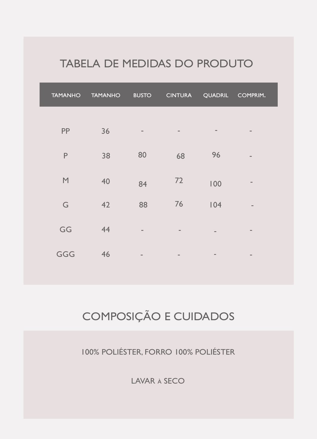 Composição:100% poliéster, forro 100% poliéster.