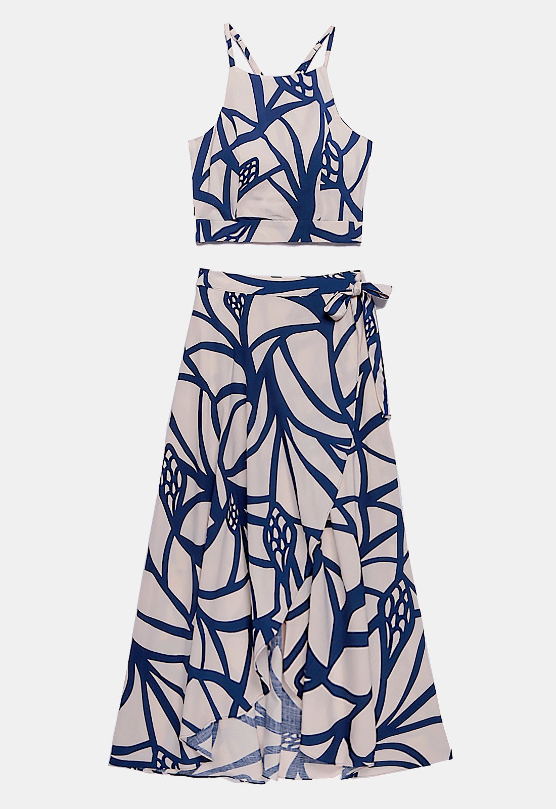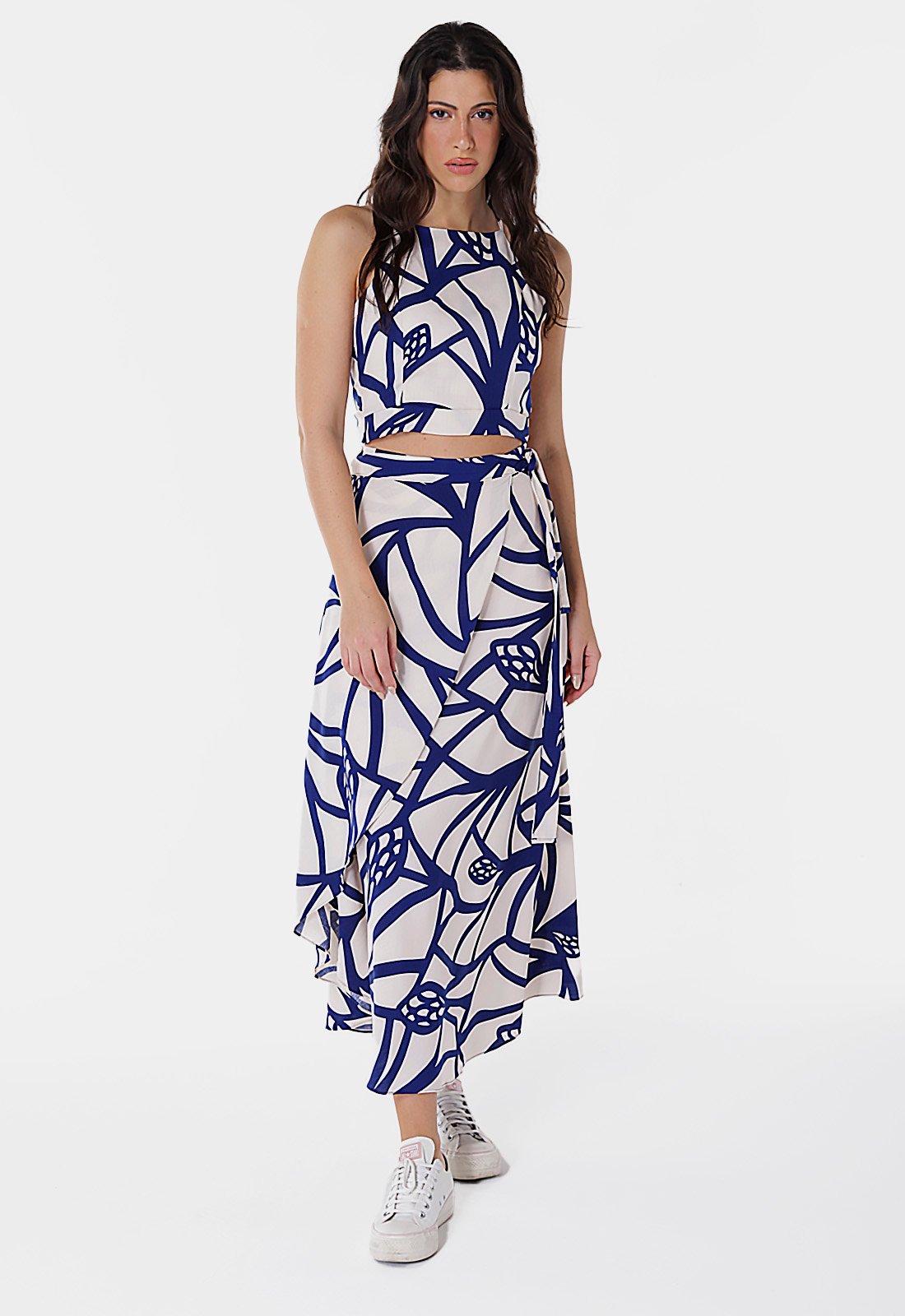 Conjunto Saia Longa e Blusa com Bojo Estampado Bege e Marinho Sob