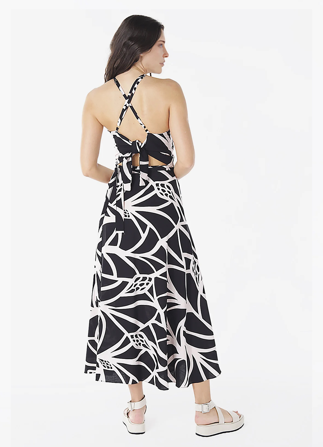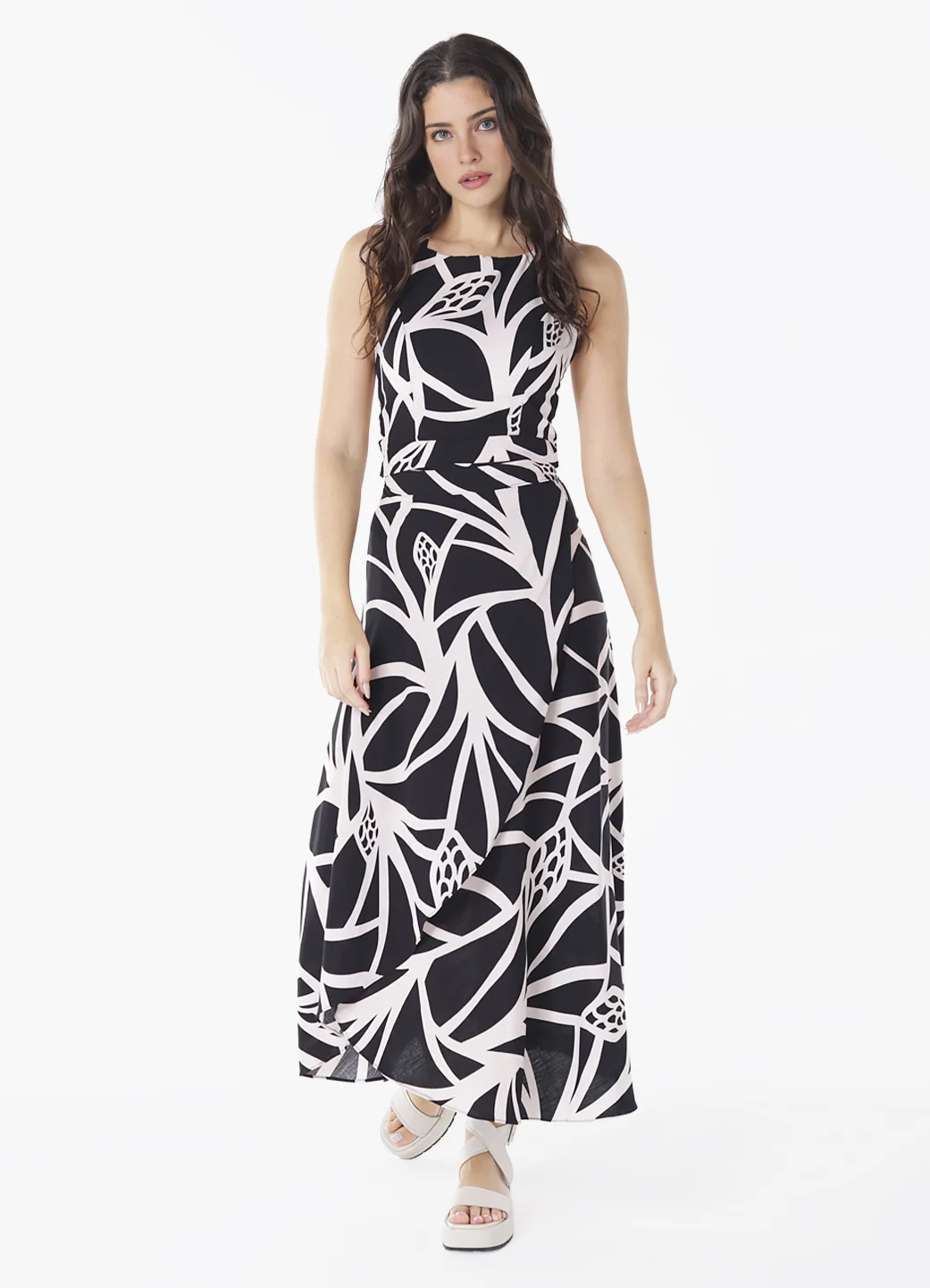 Detalhes: Top frente única de amarrar, inteiro duplo, com bojo e alças regulaveis. Saia longa transpassada de amarrar, com forro curto acompanhando o corte, em malha. Fechamento em faixa costurada para amarrar.