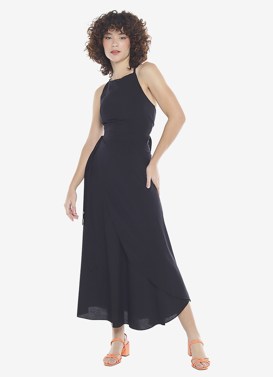 Detalhes: Top frente única de amarrar, inteiro duplo, com bojo e alças regulaveis. Saia longa transpassada de amarrar, com forro curto acompanhando o corte, em malha. Fechamento em faixa costurada para amarrar.