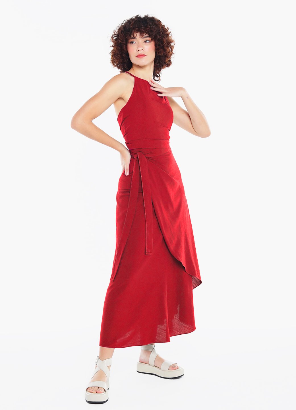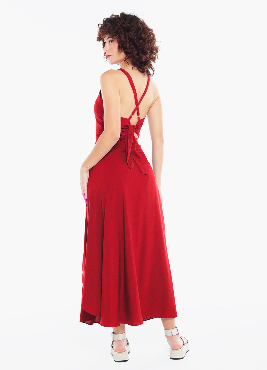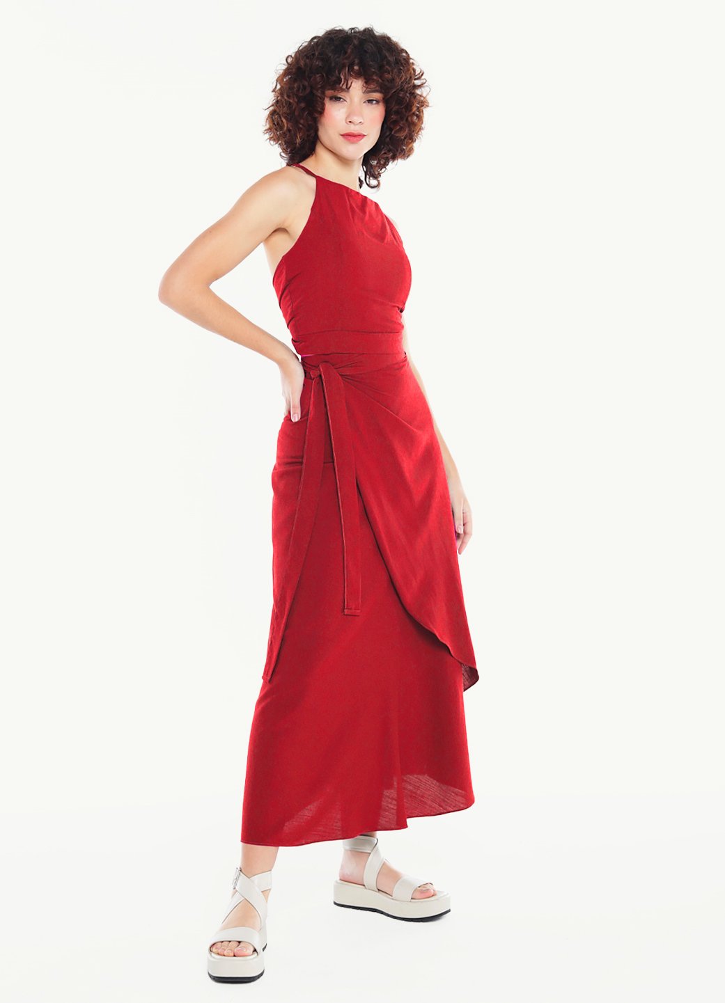 Detalhes: Top frente única de amarrar, inteiro duplo, com bojo e alças regulaveis. Saia longa transpassada de amarrar, com forro curto acompanhando o corte, em malha. Fechamento em faixa costurada para amarrar.