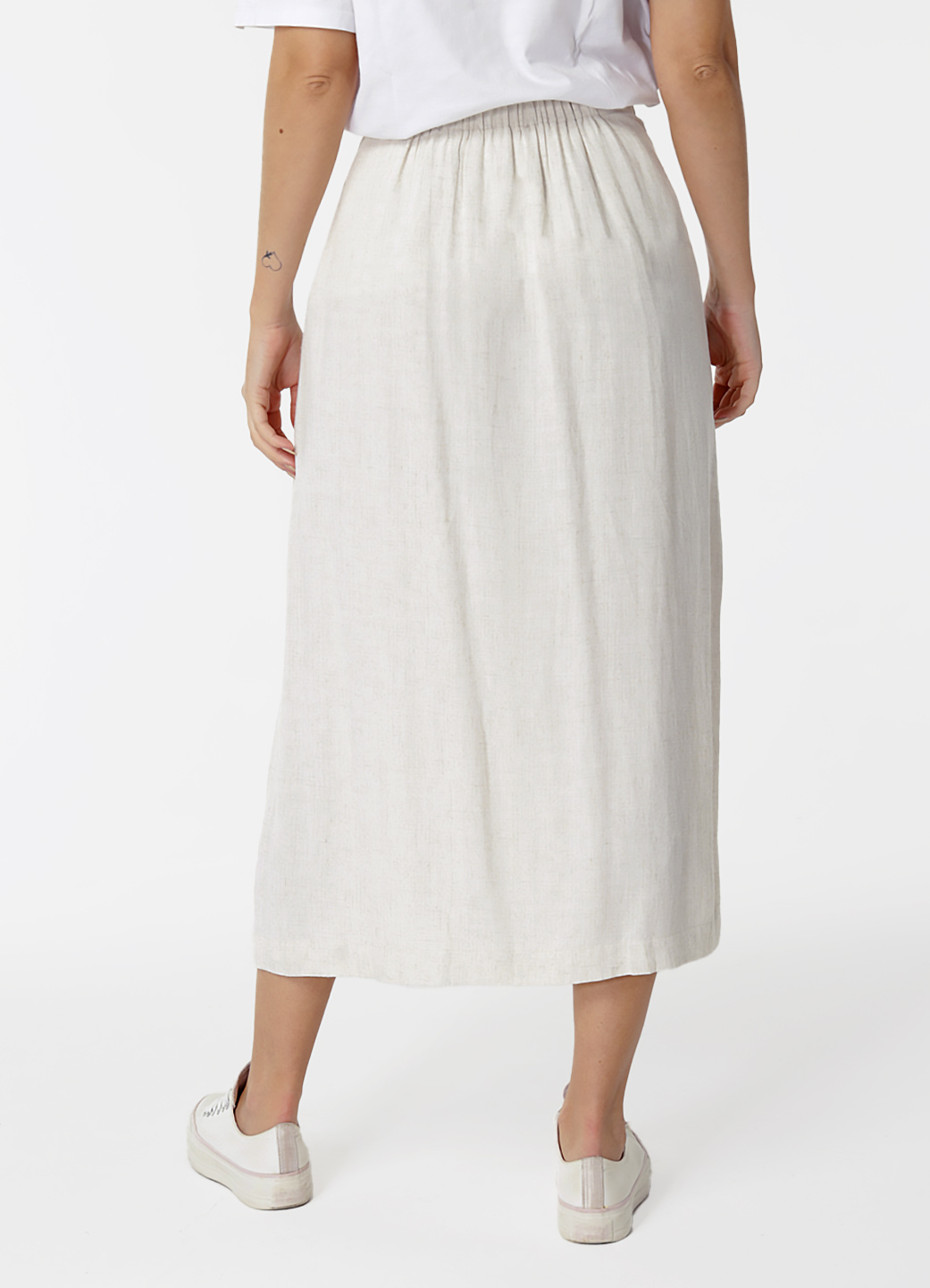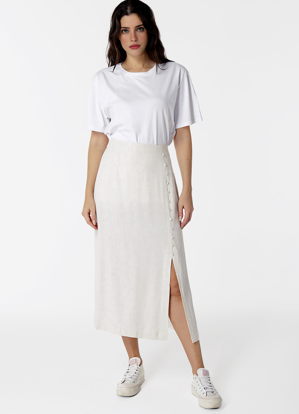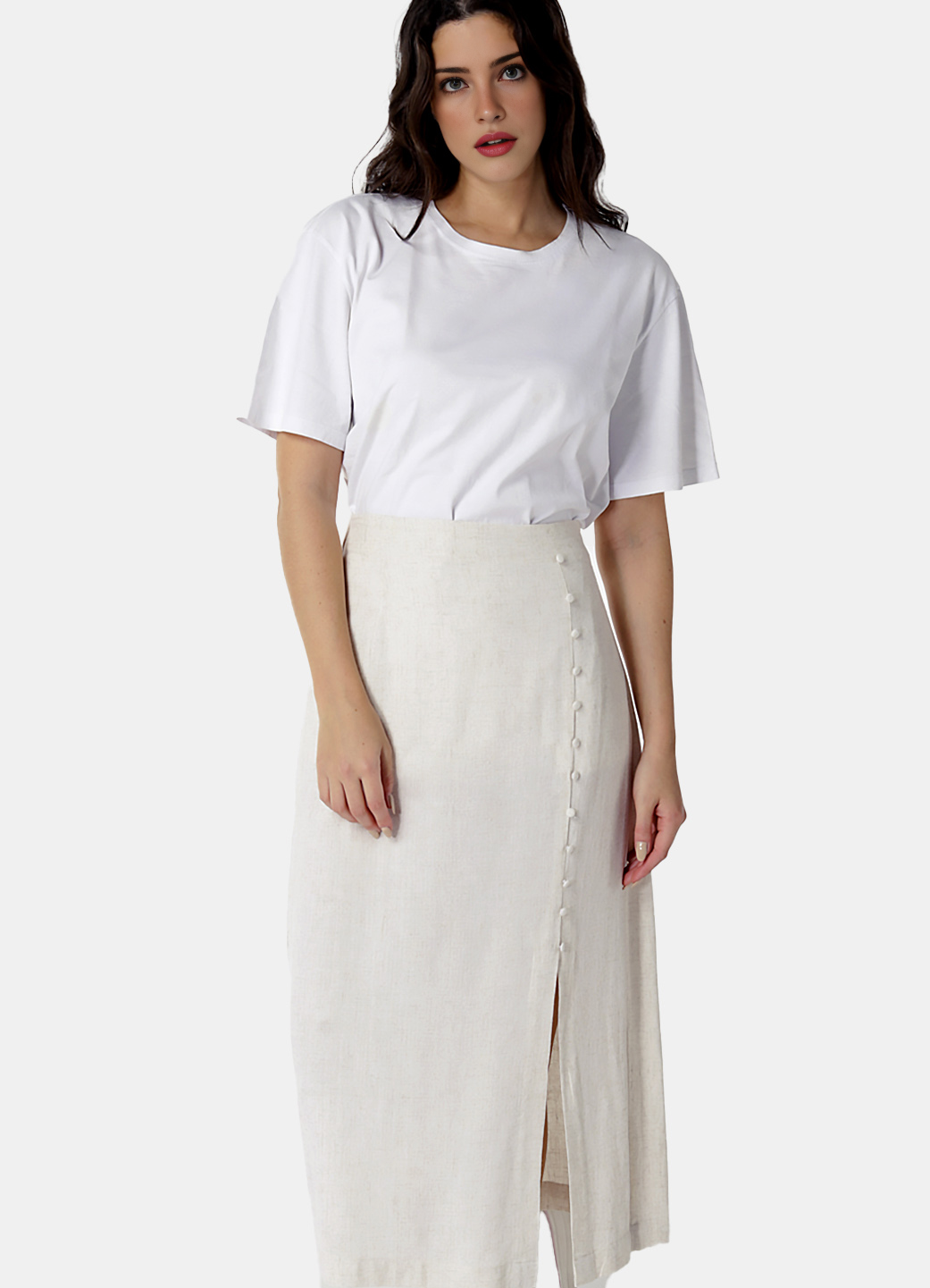 Detalhes: Saia midi de linho com fenda frontal. Cós liso com revel na frente, e recorte com detalhes em botões de enfeite forrado. Cós costas com elástico. Zíper invisivel lateral. Modelagem evasê. Sem forro.