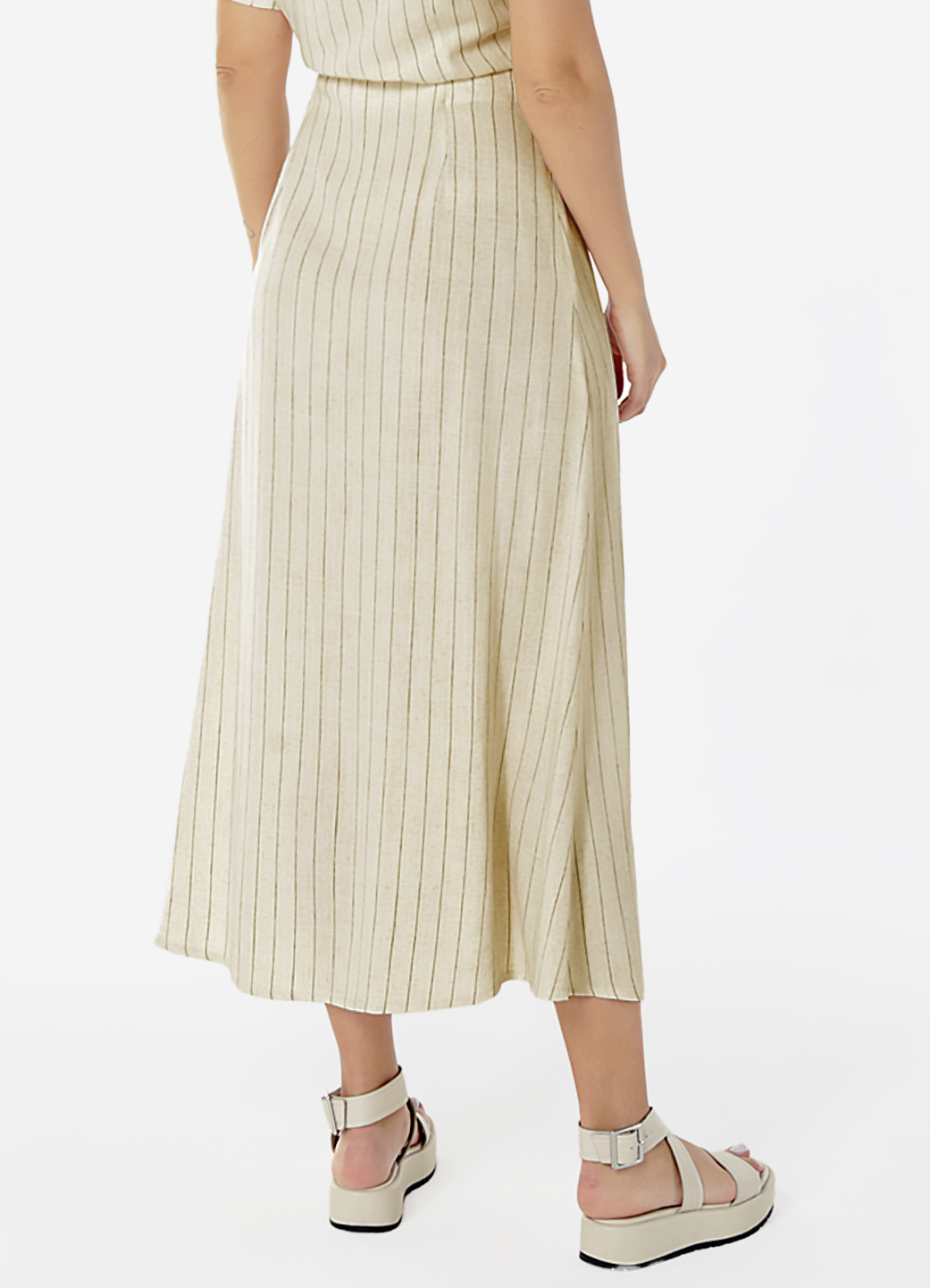 Detalhes: Saia de linho longa, bege, com abertura frontal. Cintura com revel de elástico largo, sem costura aparente. Fechamento em zíper invisível. Corte evasê. Abertura frontal até altura do joelho. Com forro até meio da coxa.