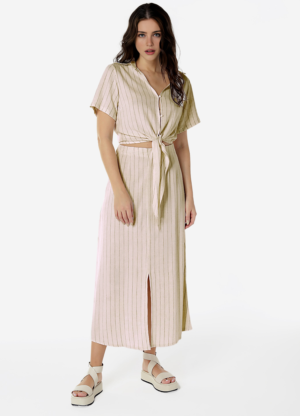 Conjunto: Blusa Bege de Linho Risca de Giz Manga Curta