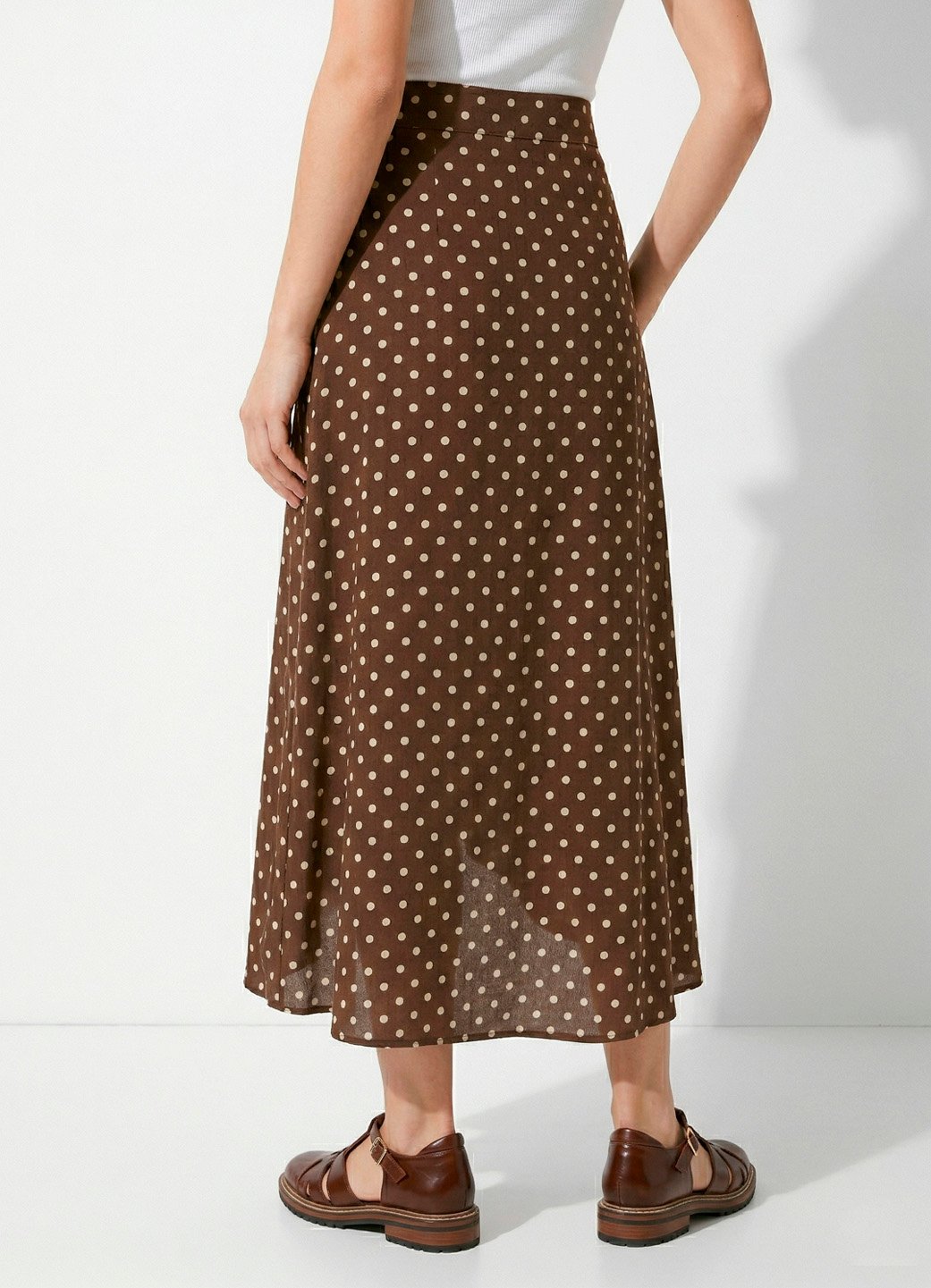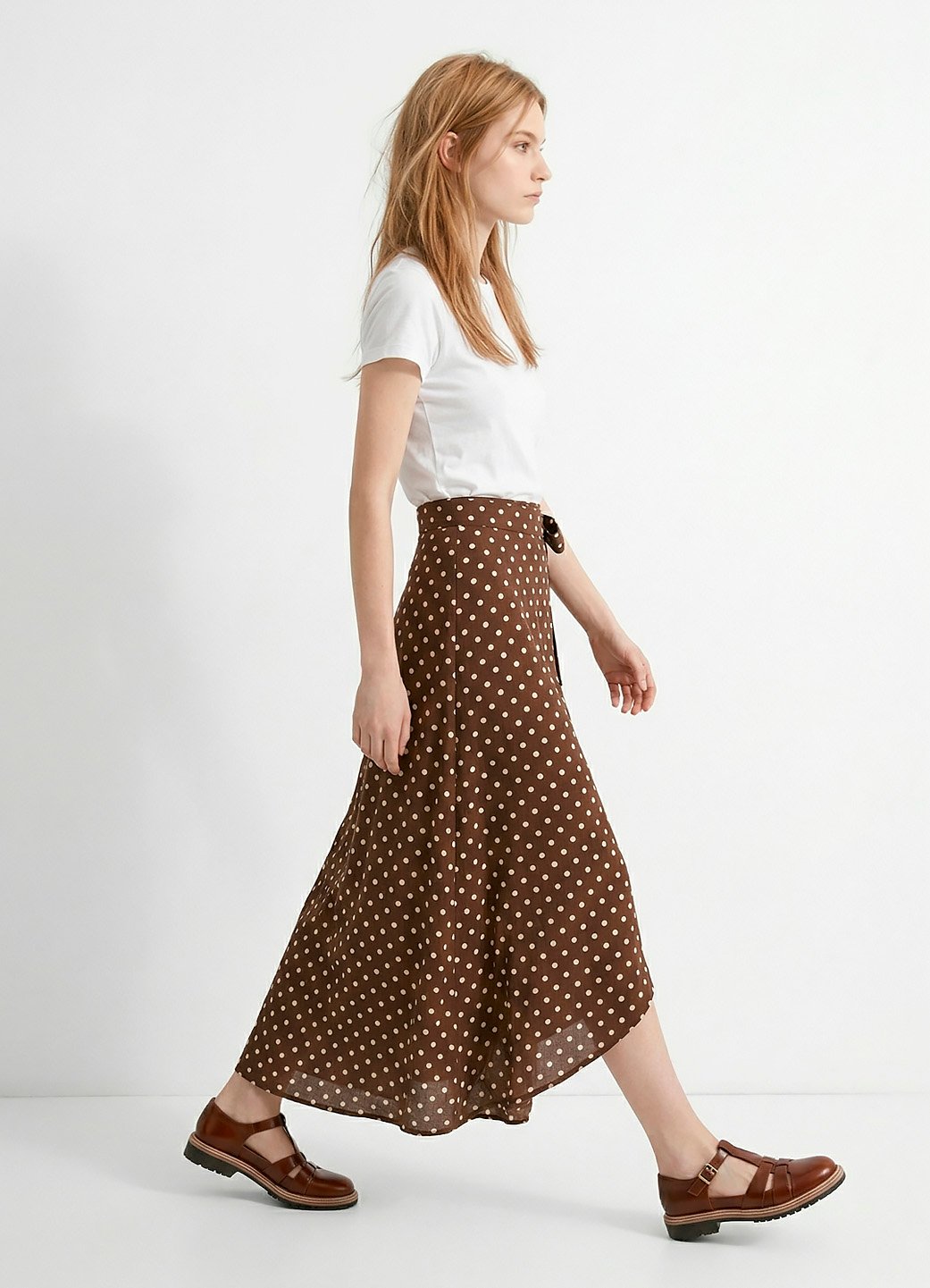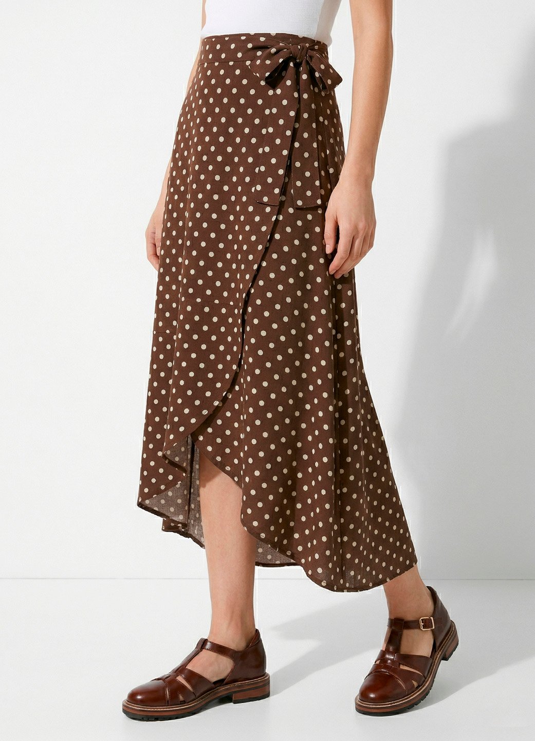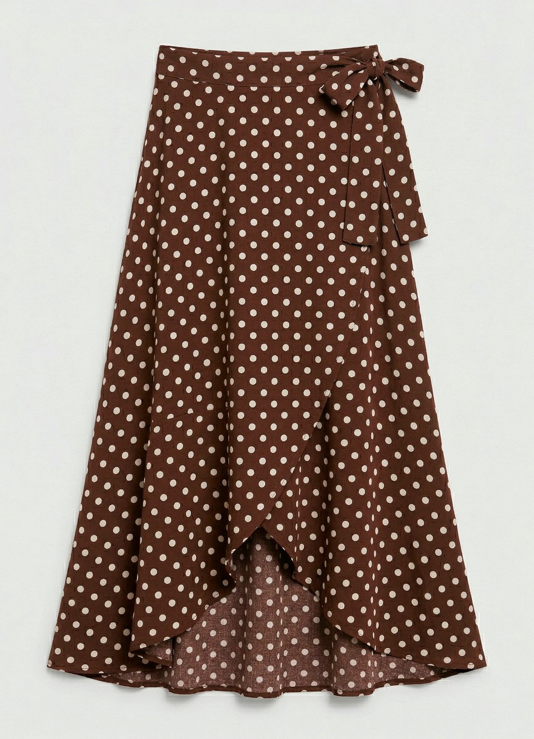 Saia Longa Marrom de Bolinhas de Viscose Poá Transpassada Sob