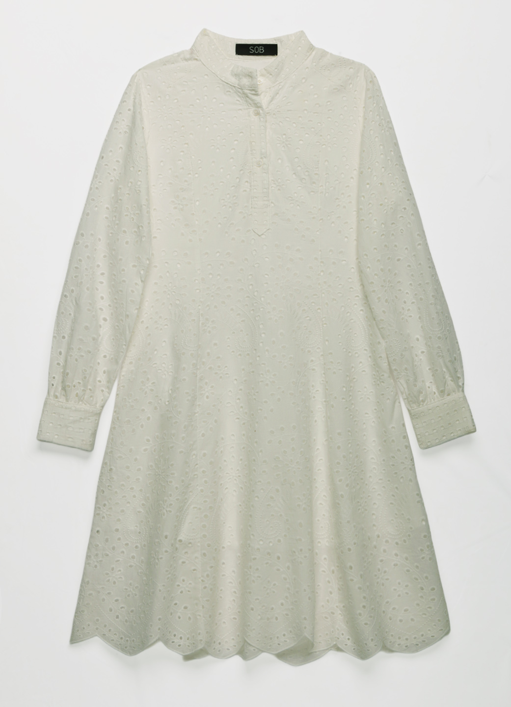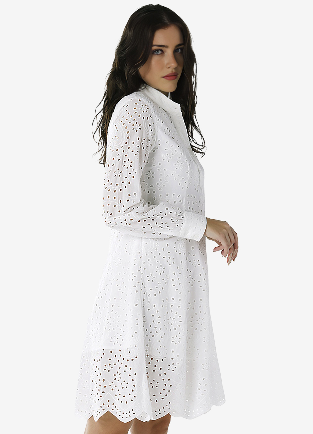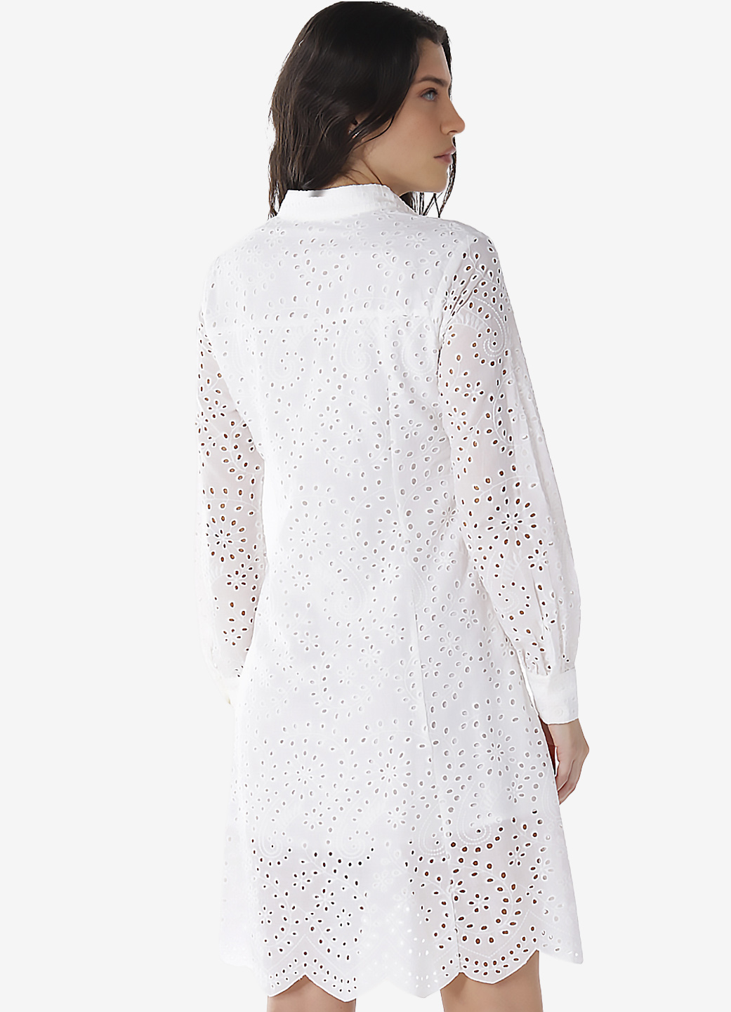 Detalhes: Vestido de laise branco até a altura do joelho. Corpo todo forrando até o meio da coxa. Mangas longas com punho e fechamento em 2 botões. Recortes verticais para melhor caimento. Produto acinturado. Gola e vista verdadeiros. Costas com pala e recorte. Comprimento até o joelho (modelo com 177cm).