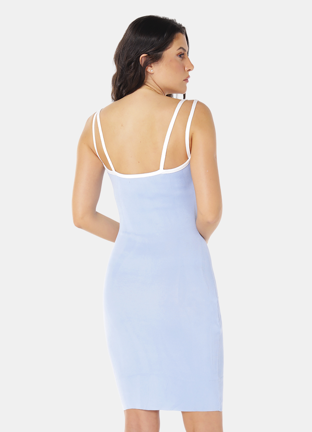 MODELAGEM PEQUENA, P/36-38 Cor: Azul claro com alças brancas Detalhes: Vestido justo em malha peso médio, de viscose, sem transparencia. Alças duplas e detalhe no decote cor branca. Comprimento: Midi, modelo com 176 cm. Composição:70% viscose, 30% nylon Instrução de lavagem: Lavar à mão, não colocar na secadora. Transparência/Forro: Sem forro, sem transparência. Modelo com…