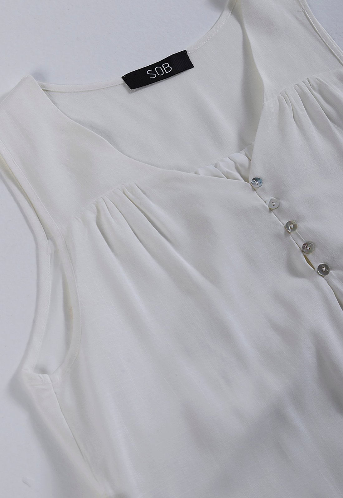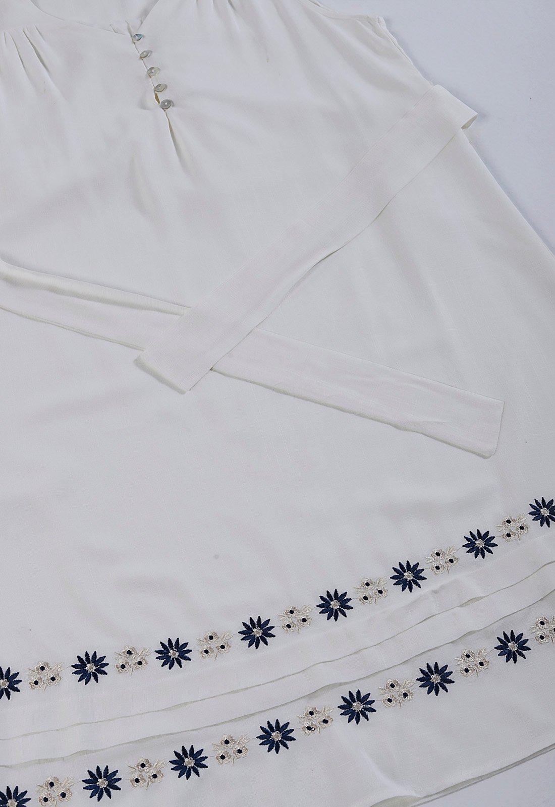 Vestido Off-White Gola V com Barra Bordada Azul Forrado Sob